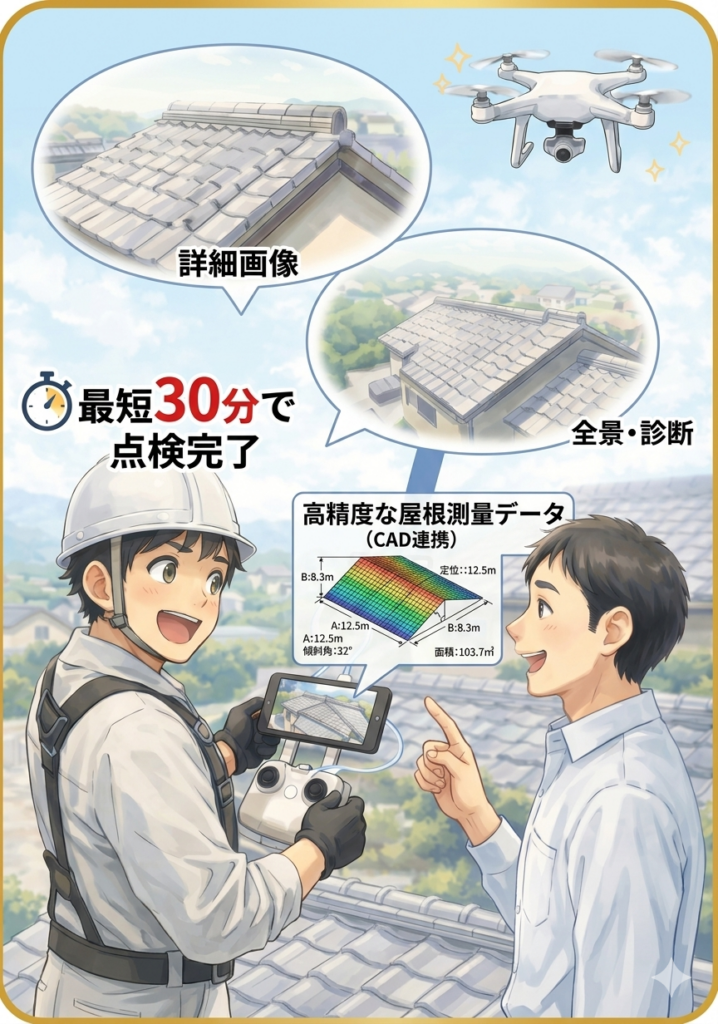ドローンを使用することで、従来の足場設置や屋根への昇降時間を大幅に短縮し、スピーディーな診断が可能です。