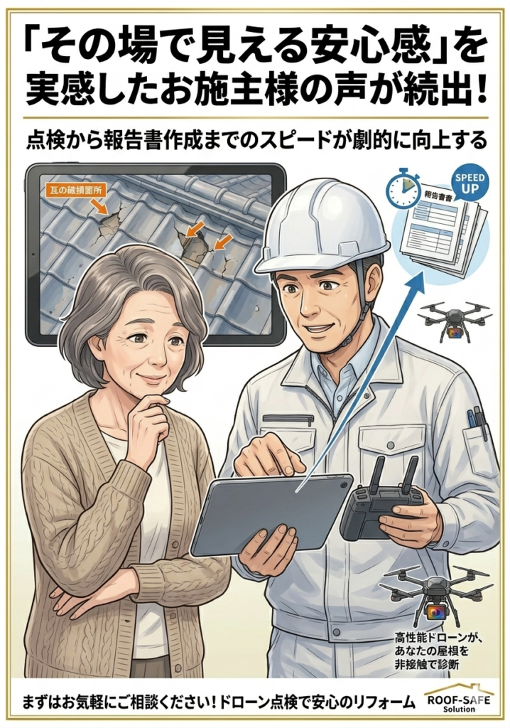 屋根に登らず、地上から安全かつ詳細に細部まで確認・説明ができるようになる