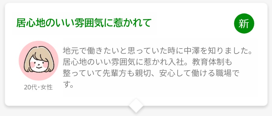 条件に合う会社を探し、ハローワークで中澤を知りました。入社後は子どもの体調不良でも理解していただき、仕事内容も丁寧に教えてもらえるので安心して働けています。